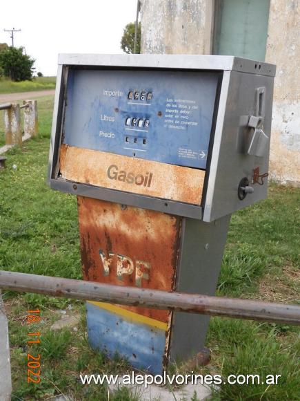 Galpones donde se acopiaban las bolsas de cereales La estación de trenes, perteneciente al Ferrocarril Sud luego FC Roca, se inauguró en 1910. Fue una estación de segunda categoría, habilitada para pasajeros, encomiendas, carga y hacienda, además contaba con telégrafo. Para llegar al pueblo se deben transitar unos 8 kilómetros desde la ruta nacional 226, por un camino de tierra en muy buenas condiciones. En ese camino antes de llegar al pueblo y sobre mano derecha, bien señalizado, sale una senda que lleva hasta la laguna, sitio donde se practican actividades de pesca y diversos deportes náuticos. El pueblo es un rectángulo dividido en dos por el predio de la estación ferroviaria, de un lado 6 manzanas casi sin viviendas y del otro lado 12 manzanas donde se concentran la mayoría de los aproximadamente 70 habitantes. Como casi todos los pequeños pueblos la cantidad de pobladores va descendiendo debido al éxodo de habitantes hacia las ciudades en busca de mejores oportunidades. Llegando al pueblo nos recibe el ahora clásico cartel de letras grandes. Enseguida vemos una de las joyitas del pueblo, una estación de servicio YPF abandonada hace muchos años y que se conserva bastante original con sus letras y su surtidor de nafta. La estación de servicio data aproximadamente de los años 30, concejales de la municipalidad de Olavarría han impulsado un proyecto de ordenanza para declararla Patrimonio Histórico Municipal.